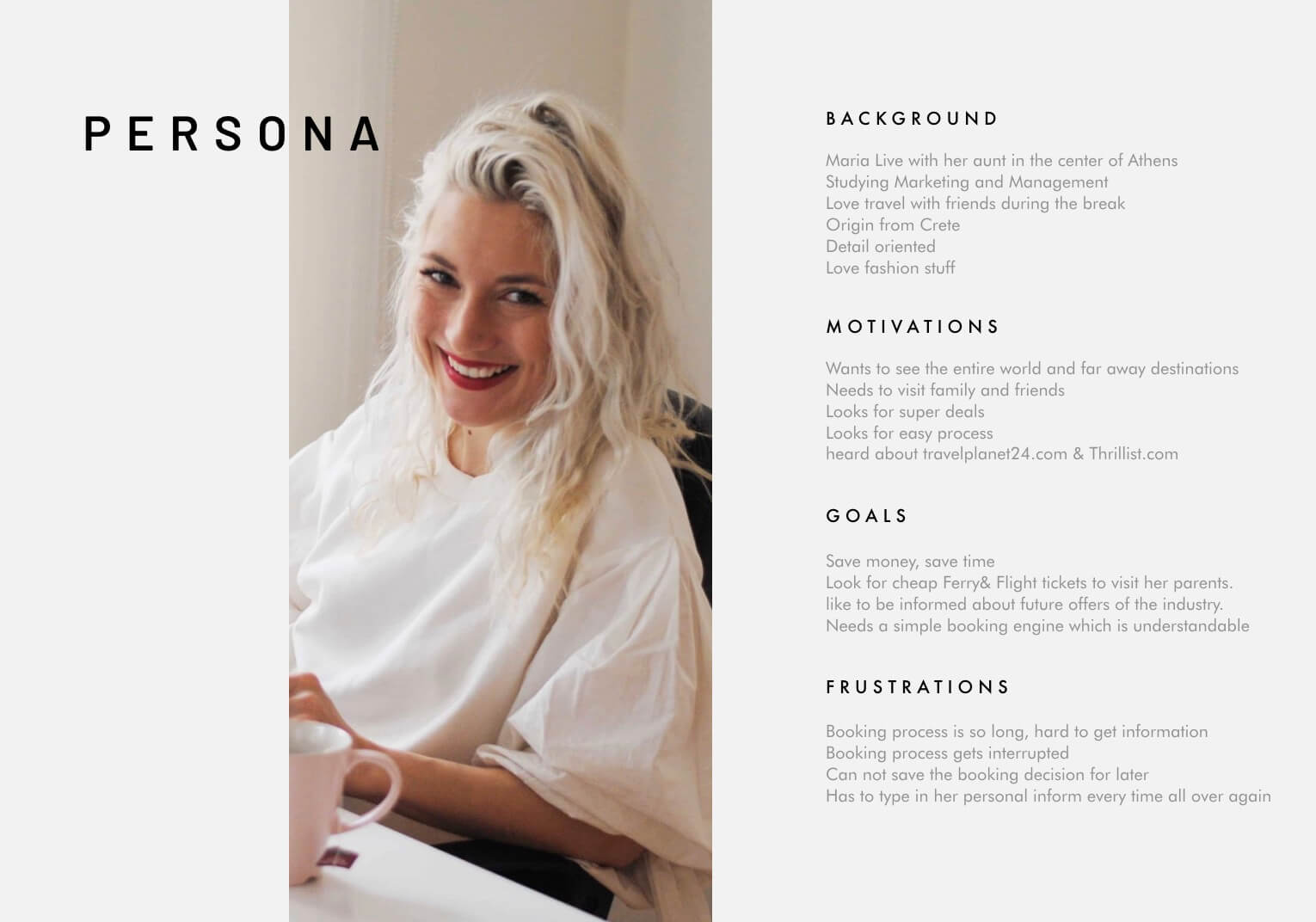 In addition to gathering competitor research, I conducted five interviews with people using their favorite flight booking tool. Overall, I conducted twelve semi-structured interviews and observations, and used the information gathered about their habits and preferences to graph the relationships between this data. From this data, I distilled the information into a persona based on one of my interviewees, Maria, because she represented a subset of short-distance travelers who focus on vacation travel and domestic flights.