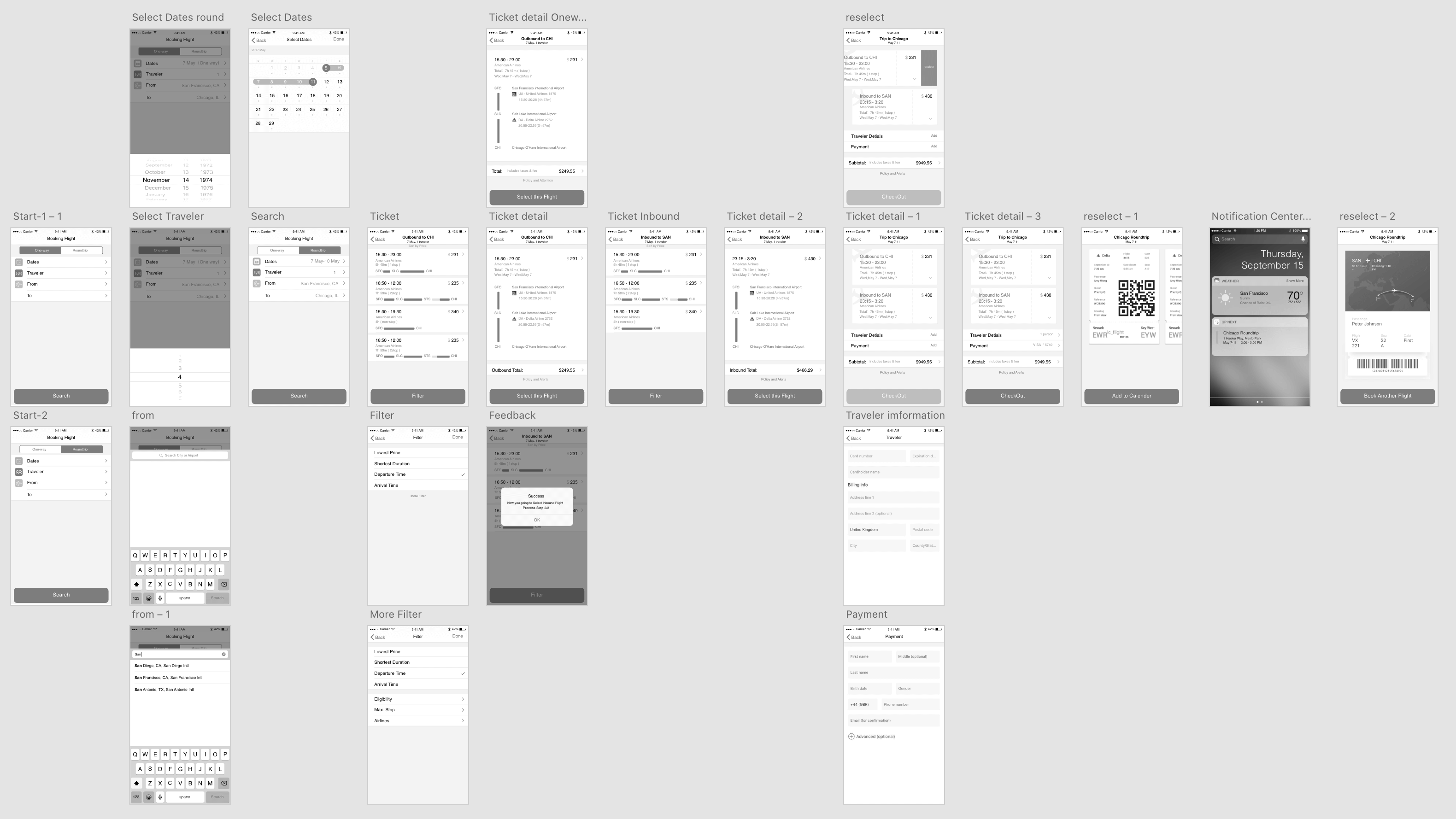 After completing my Flinto prototype, I tested it with several participants using the same prompts. These prompts included: "Imagine you'd like to book a flight from San Francisco to Chicago from Dec 20th to Dec 23rd, show me how you would do that" and "Imagine you are booking a flight from SFO to CHI with a friend and your dog, show me how you would do that".